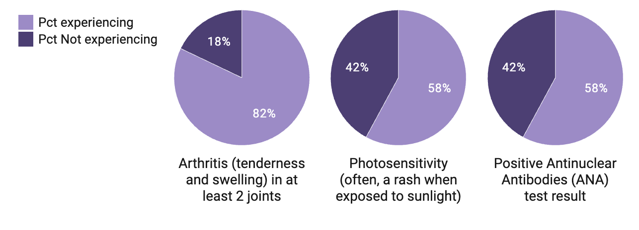 The most common symptoms at the time of lupus diagnosis were arthritis, photosensitivity, and a positive ANA test. Interestingly, the telltale malar (butterfly) rash was reported by only 41% of people at the time of diagnosis.